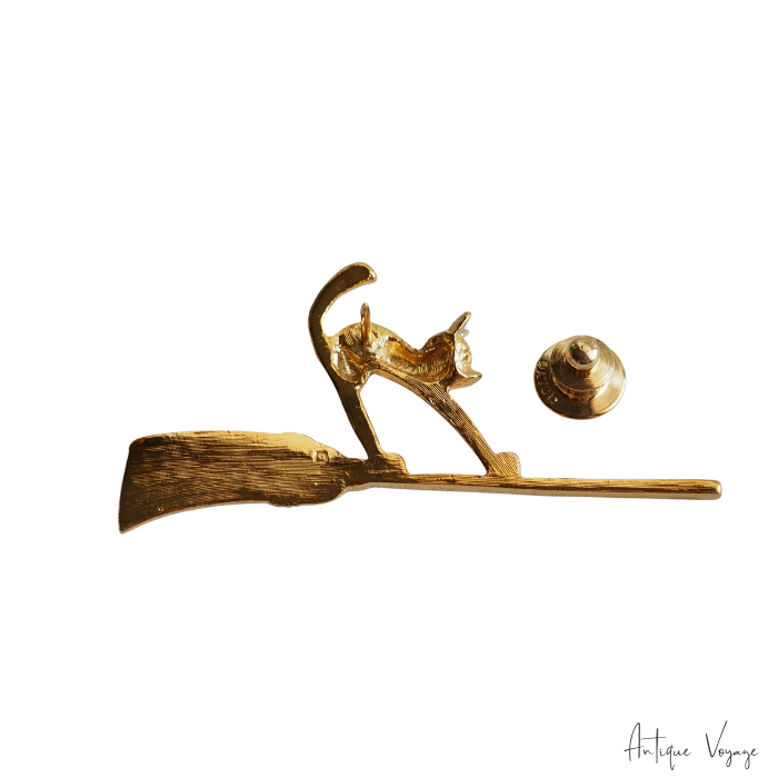 アメリカの老舗化粧品メーカーAVON(エイボン)社によって1989年にプロデュースされた「bewitching cat pin」、ほうきに乗った魔女猫のブローチ/タックピンです。