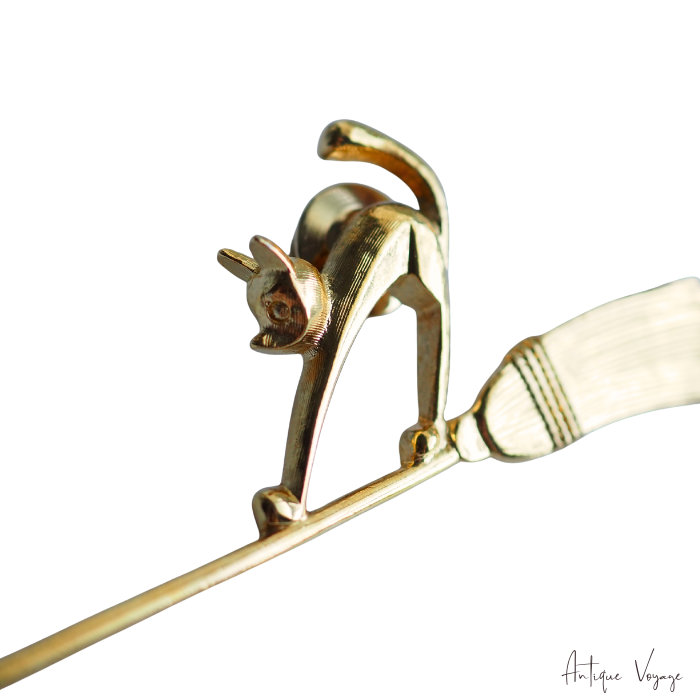 ゴールドトーンのメタル製で、ほうきに乗ってビックリ?可愛い猫の様が立体的に模られています。