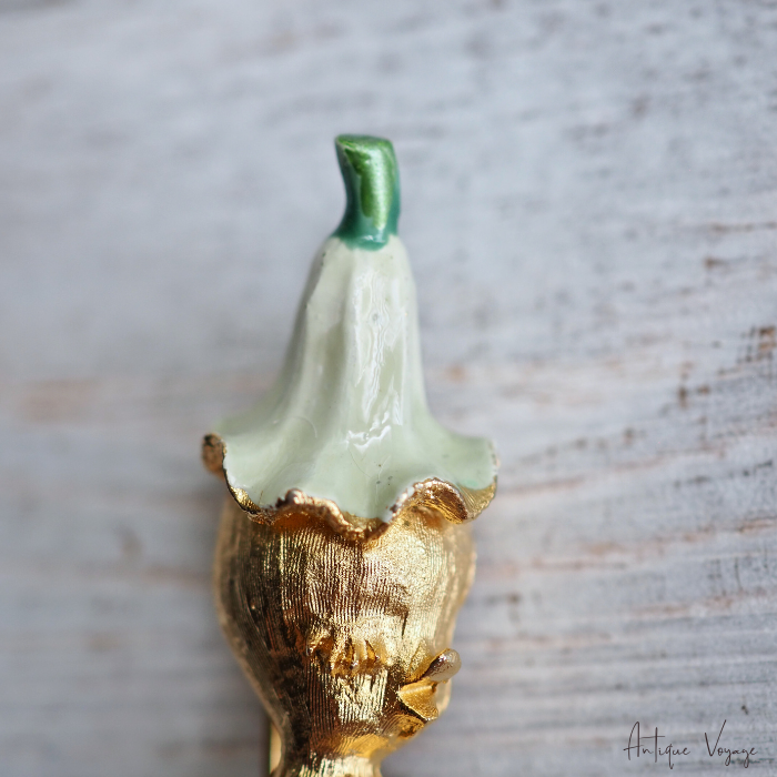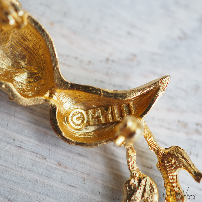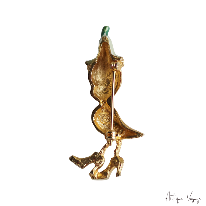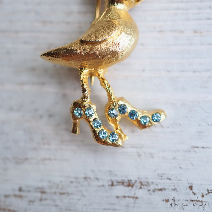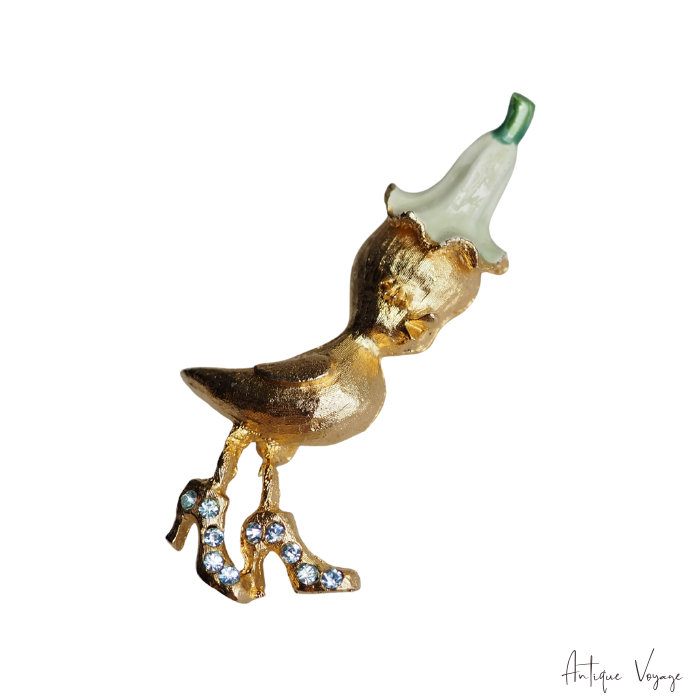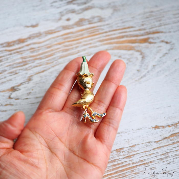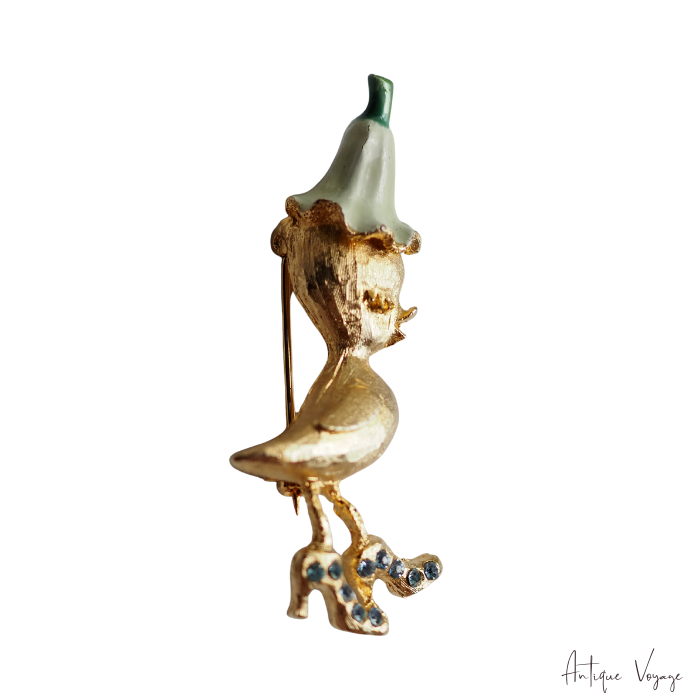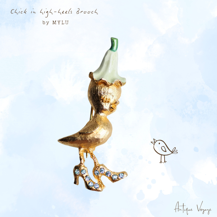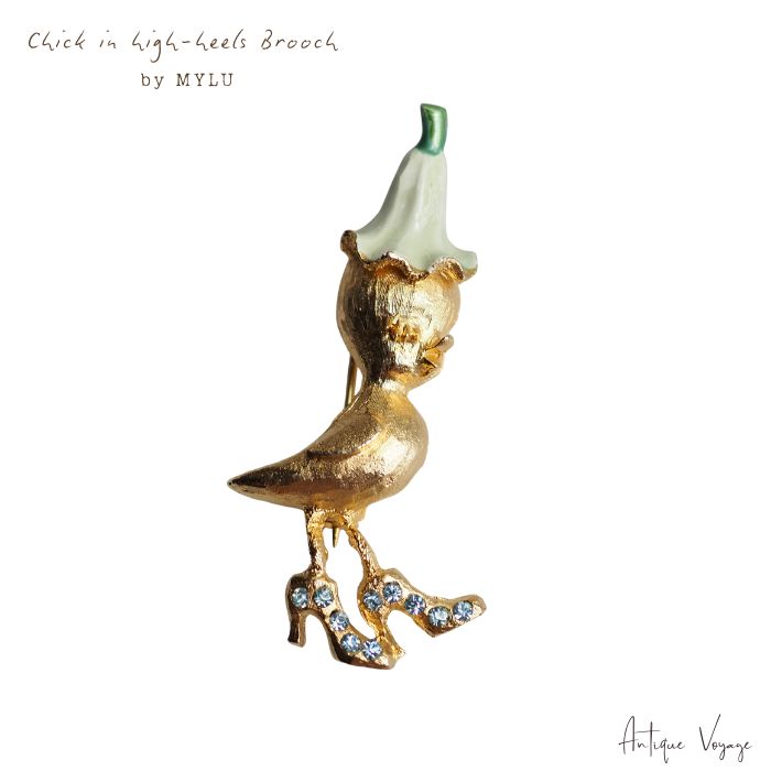 ゴールドトーンのメタル製で、細かく模られたヒヨコのボディには、帽子にパステルイエローとトップに若草グリーンのエナメルペイント、ハイヒールにはアイスブルーのラインストーンがあしらわれています。