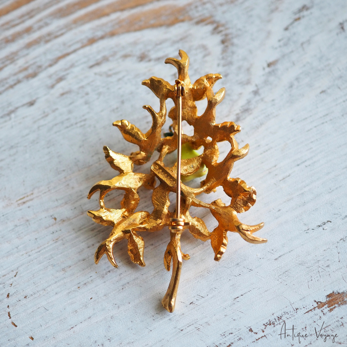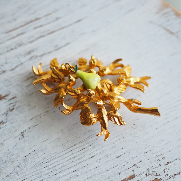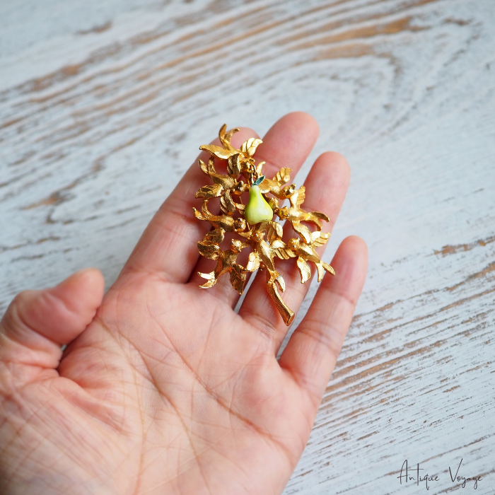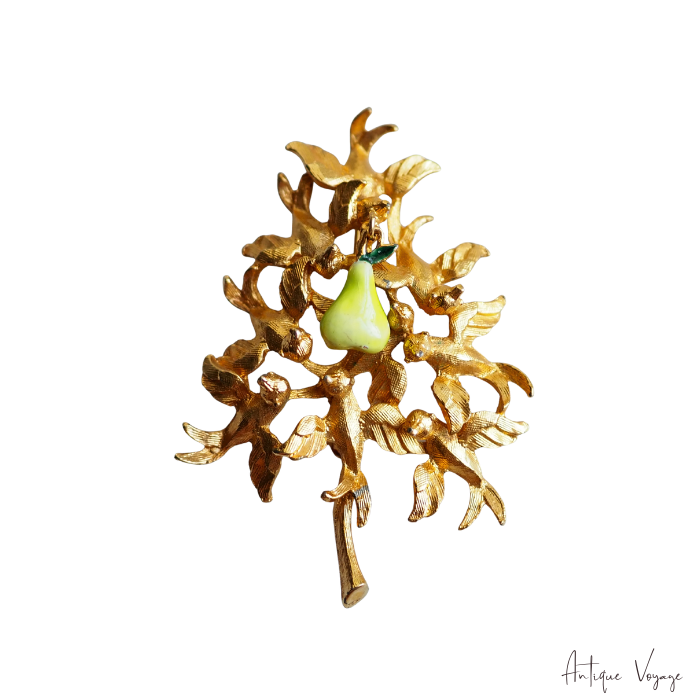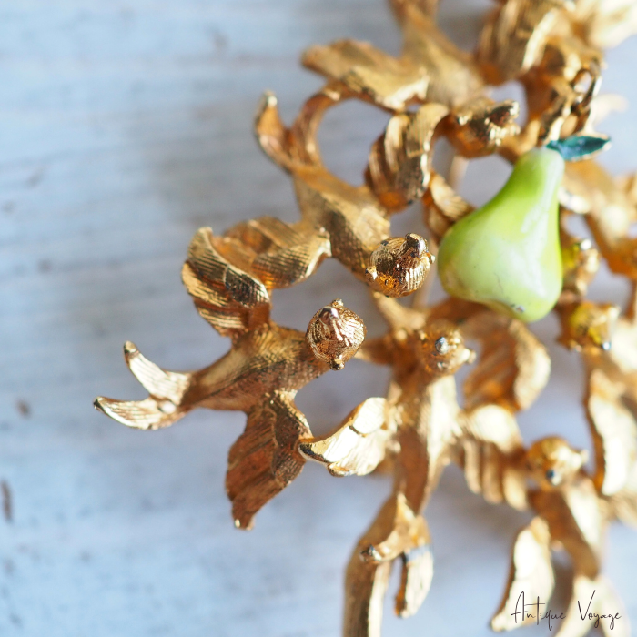 CADORO (カドロ)の小鳥で模られたペアツリー「梨の木のヤマウズラ」、アーティスティックなクリスマスツリーのヴィンテージ・ブローチです。