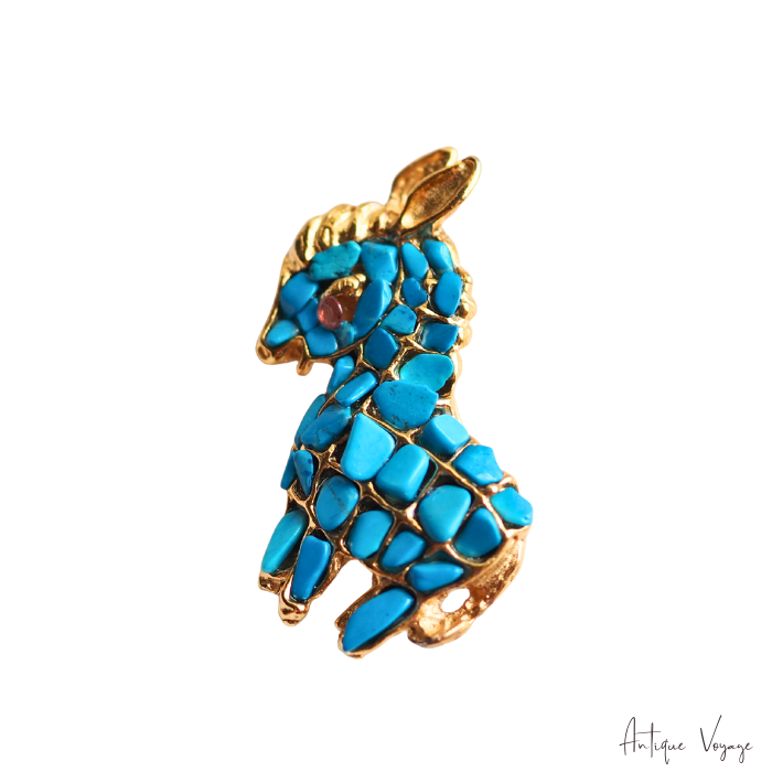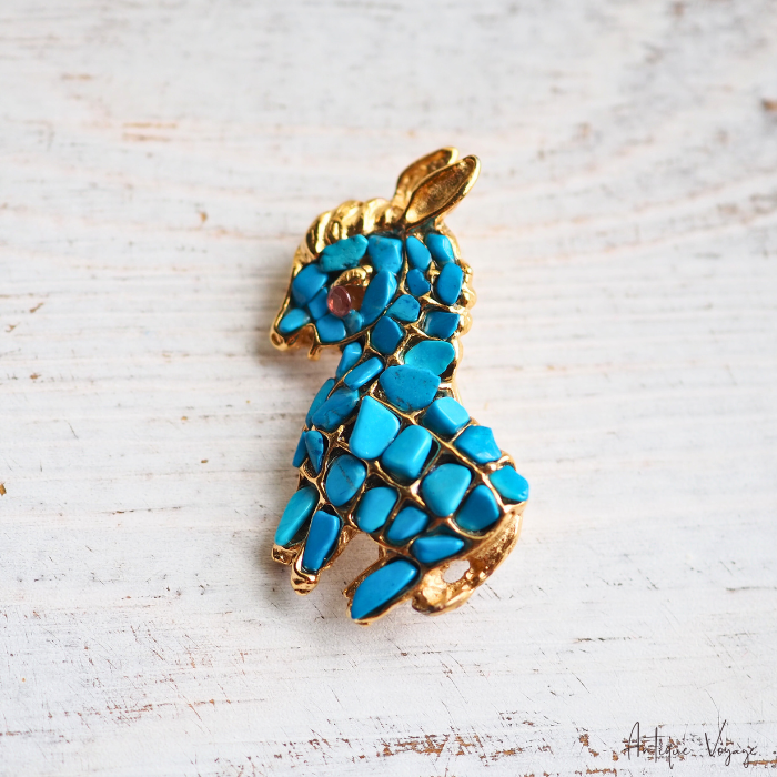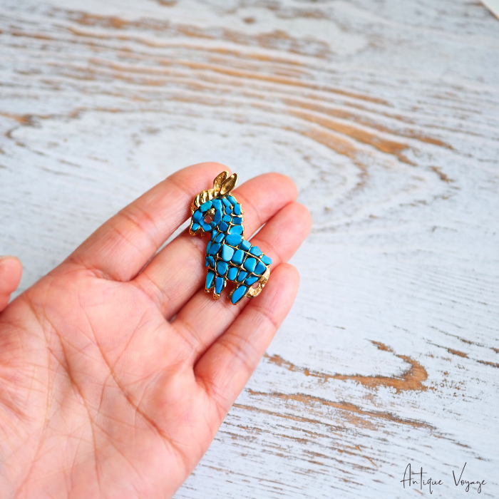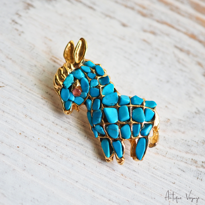 24K金メッキ・ゴールドトーンのメタル製で、細かく模られたロバのボディには、全てハンドセットで、瞳に小さなガーネット、お顔とボディ全体にターコイズブルーのハウライト天然石が敷き詰められています。