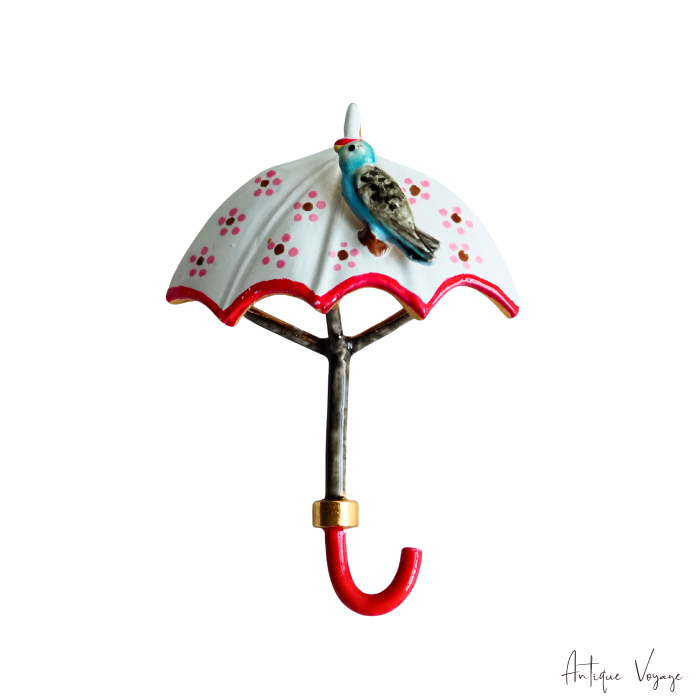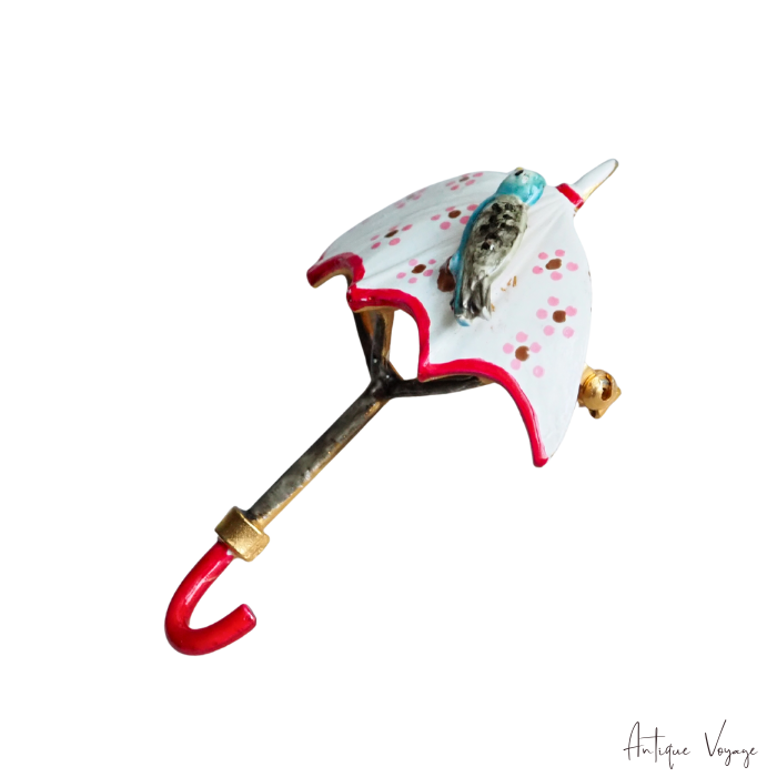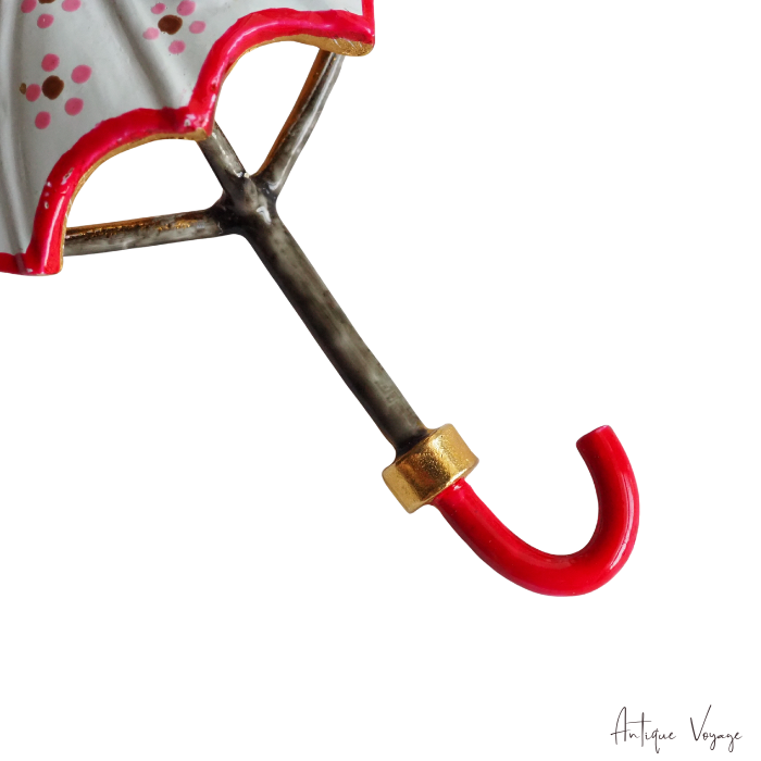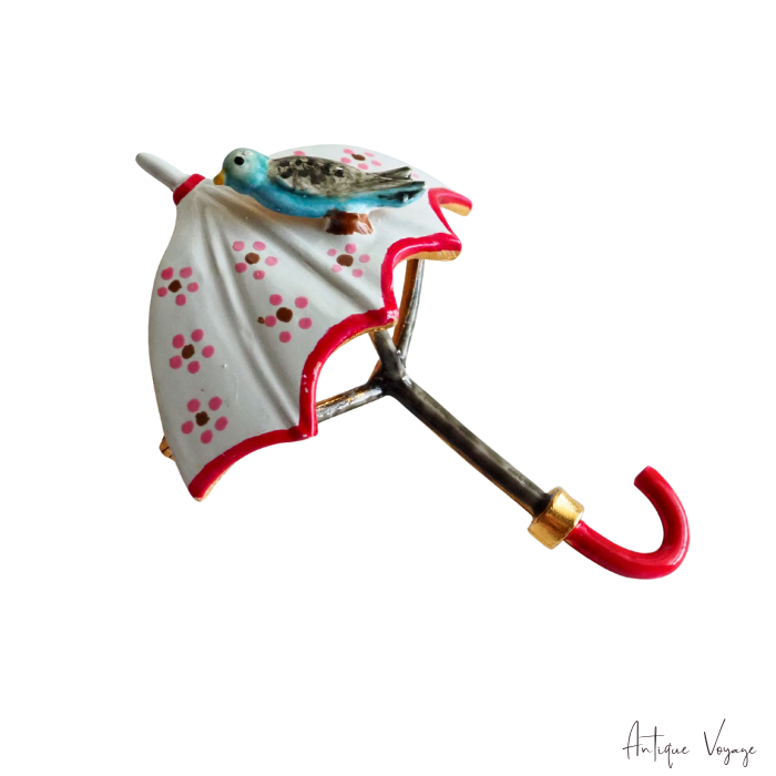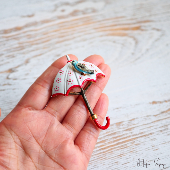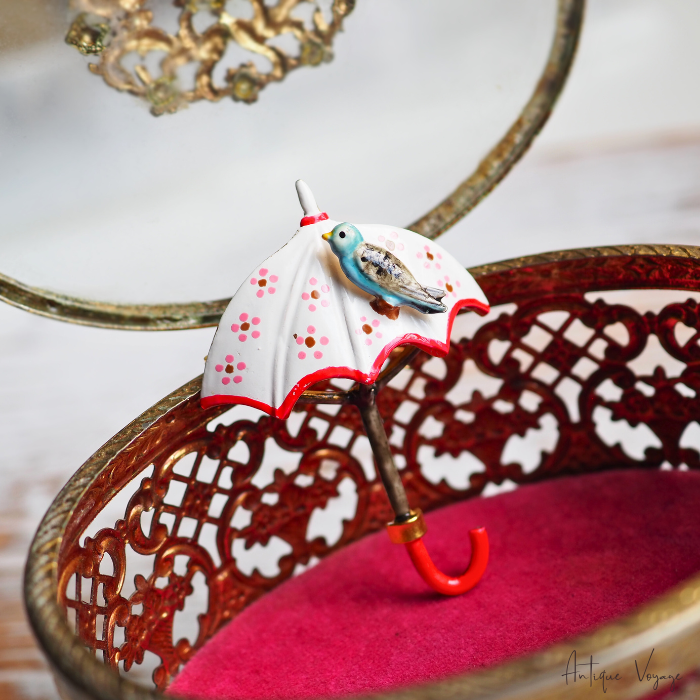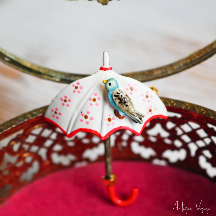 ゴールドトーンのメタル製で、立体的に模られた傘の表面には、白地にピンクとブラウンの花模様が描かれ、ハンドルと布縁に明るいレッド、中棒にブラック、ちょこんと傘の上にとまった小鳥のボディは水色、ブラック、イエロー、ブラウンの、エナメルペイントで色づけされています。