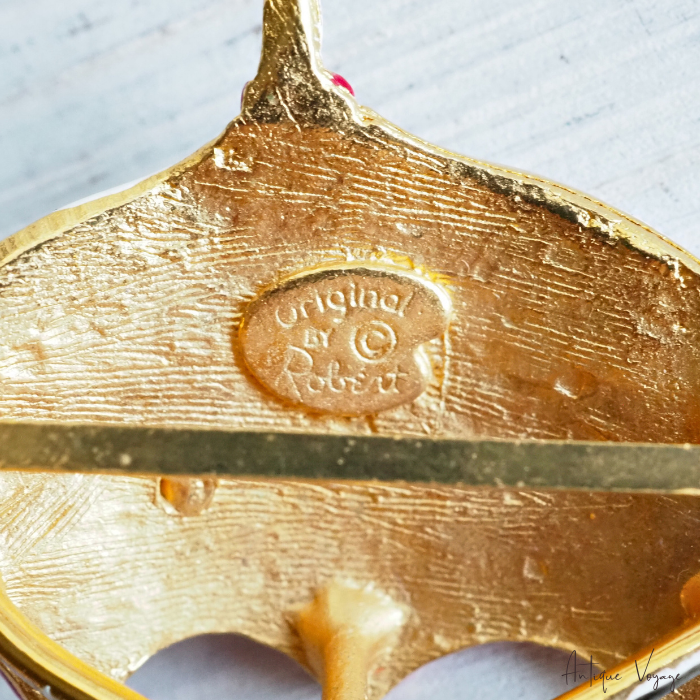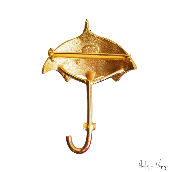 ORIGINAL BY ROBERT (オリジナル バイ ロバート)の、ハンドペイントで描かれた、赤い花柄傘と小鳥のヴィンテージ・ブローチです。