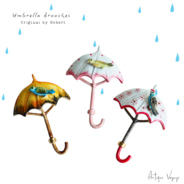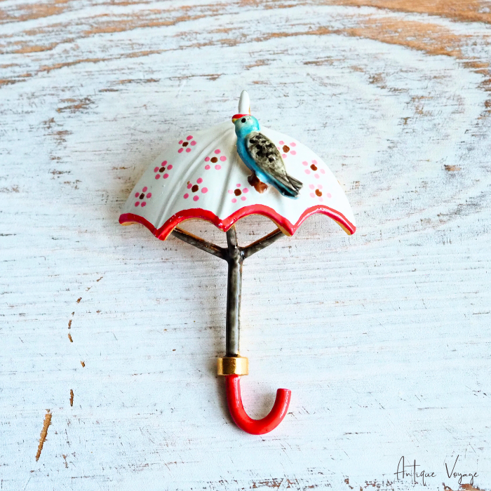 憂鬱なお天気でも気分を明るくしてくれる、フェミニンなアンブレラと可愛らしい小鳥のブローチです。