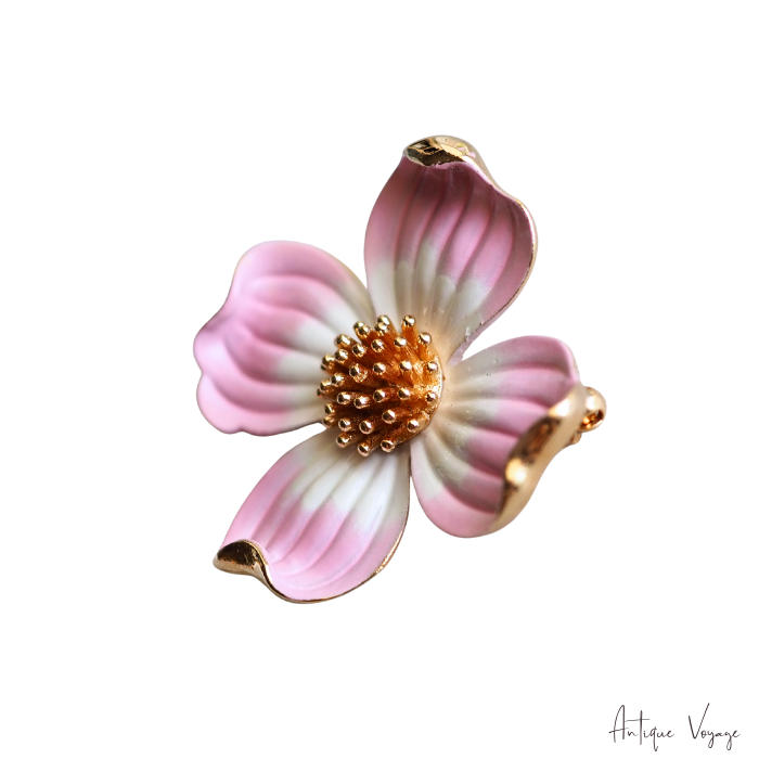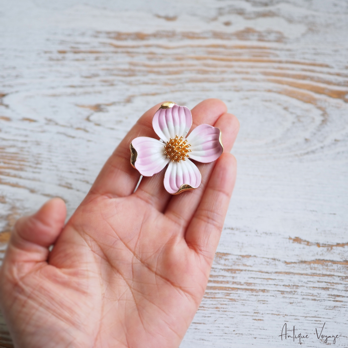 ゴールドトーンのメタル製で、立体的に模られたハナミズキの花びらには、白いエナメルペイントを基調に、外側部分に淡いパステルピンクのペイントが重ね塗りされています。
