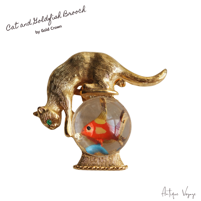 アメリカのジュエリー・メーカー「Gold Crown(ゴールドクラウン)」の、金魚鉢の上で金魚とにらめっこする猫のヴィンテージ・ブローチです。