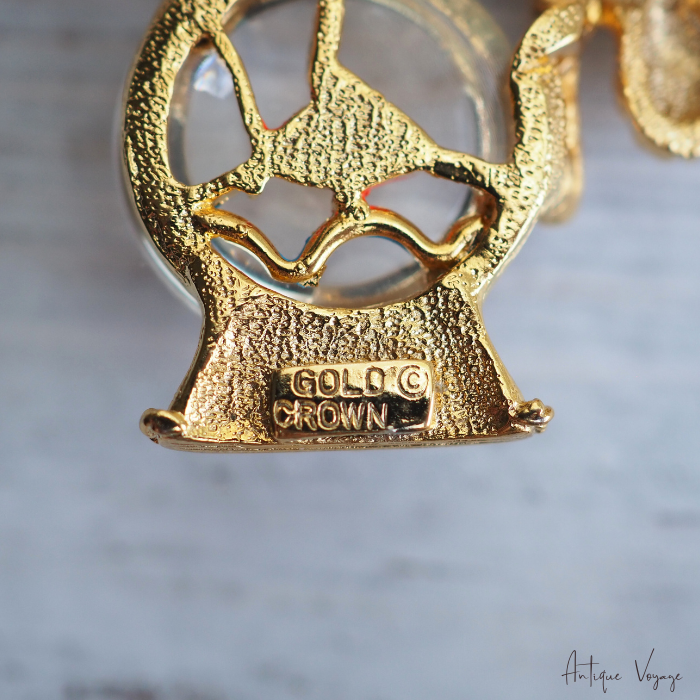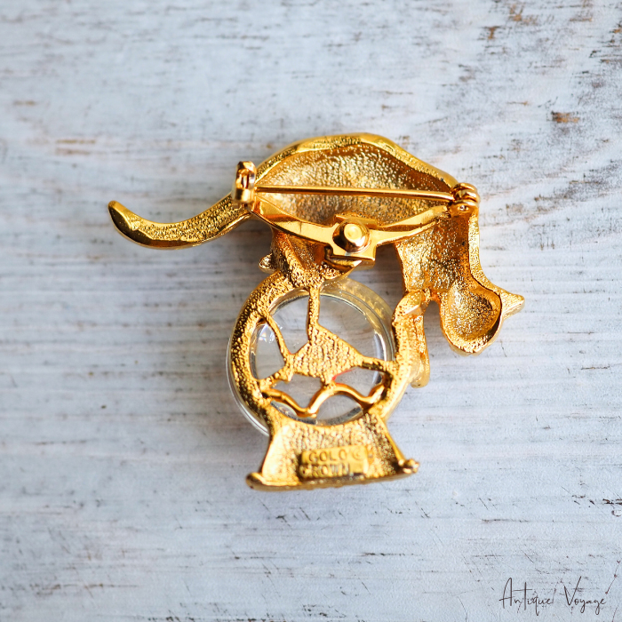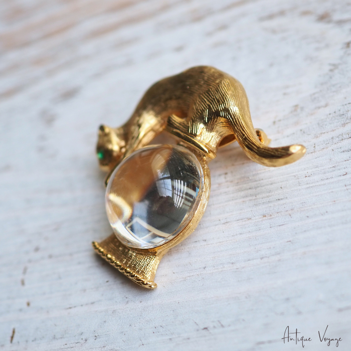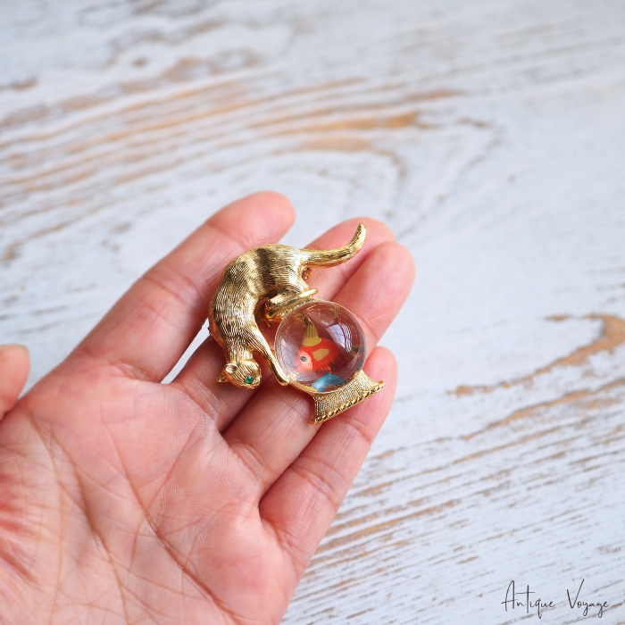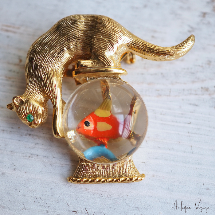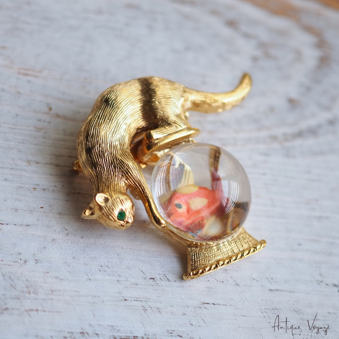 「猫と金魚鉢」モチーフのブローチは様々なメーカーから多種制作されていますが、こちらのGold Crown製のものは常に人気がございます。