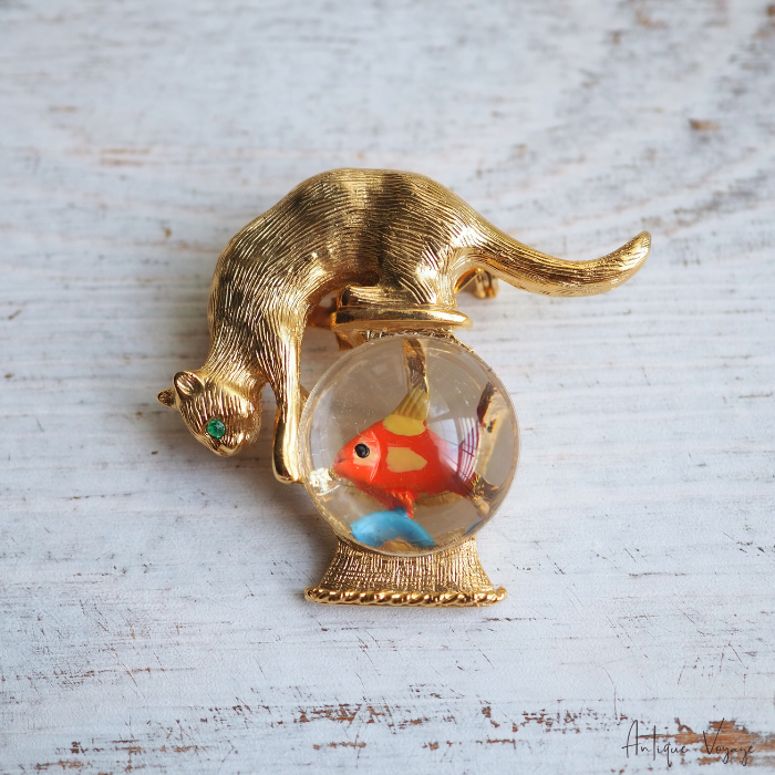 GOLD CROWN(ゴールド・クラウン)☆金魚鉢の上でにらめっこ 猫と金魚のヴィンテージ・ブローチ