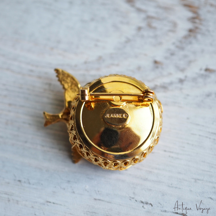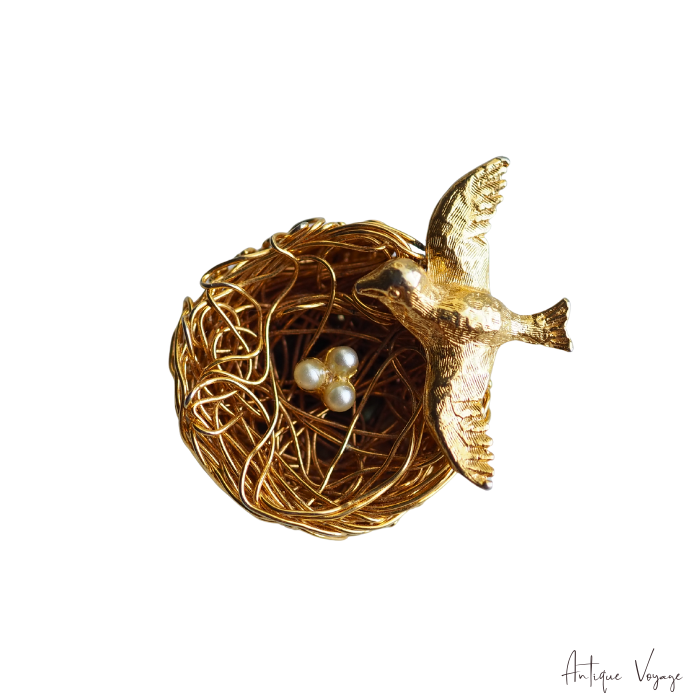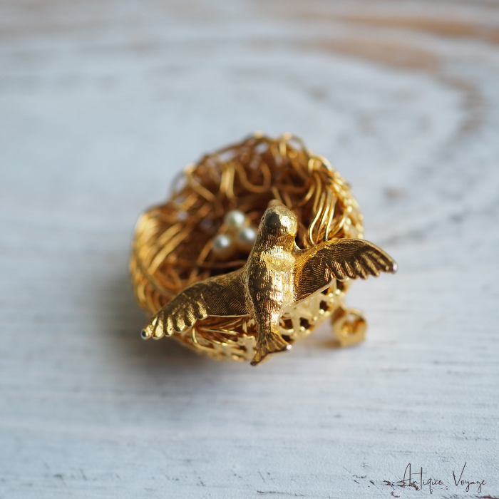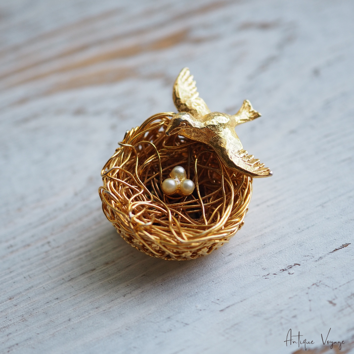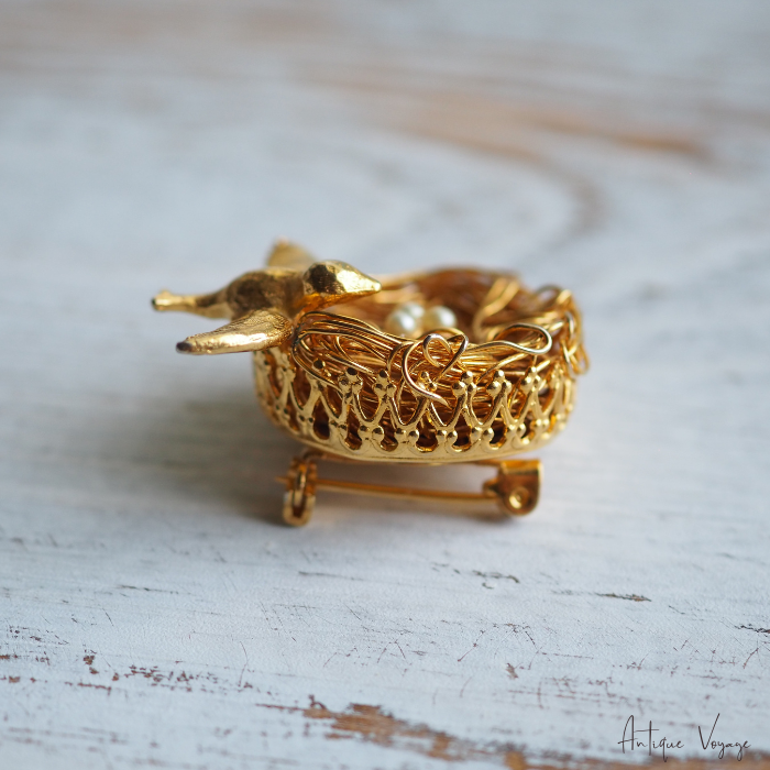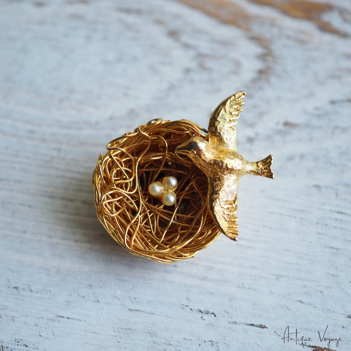イエローゴールドトーンのメタル製で、鳥の巣はワイヤーを絡めたような作り、その横には巣を見守る親鳥の姿が細かく模られ、巣の中には卵に見立てられた小さな人工パールが3つ施されています。