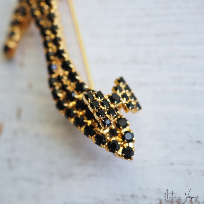 カリフォルニアのアーティストDorothy Bauer(ドロシー・バウアー)による、マットブラックのスワロフスキー・ラインストーンでデザインされた、リボンとハイヒール 靴のヴィンテージ・ブローチです。