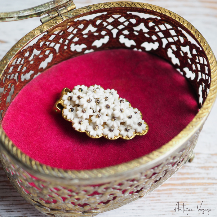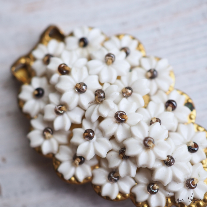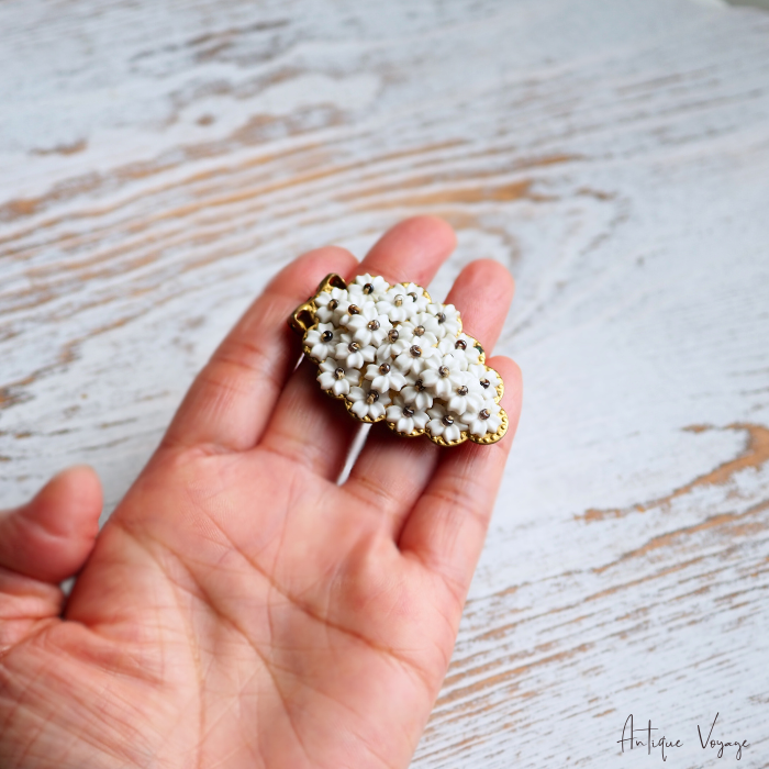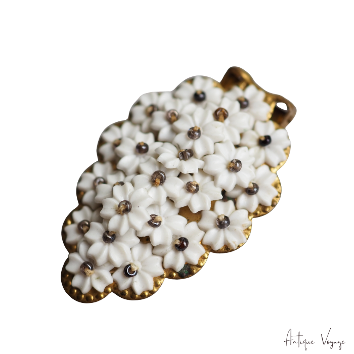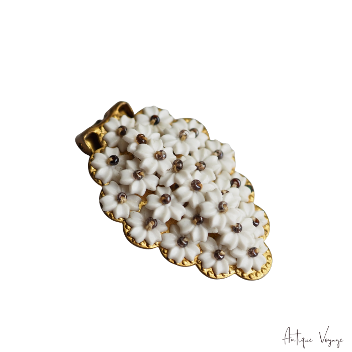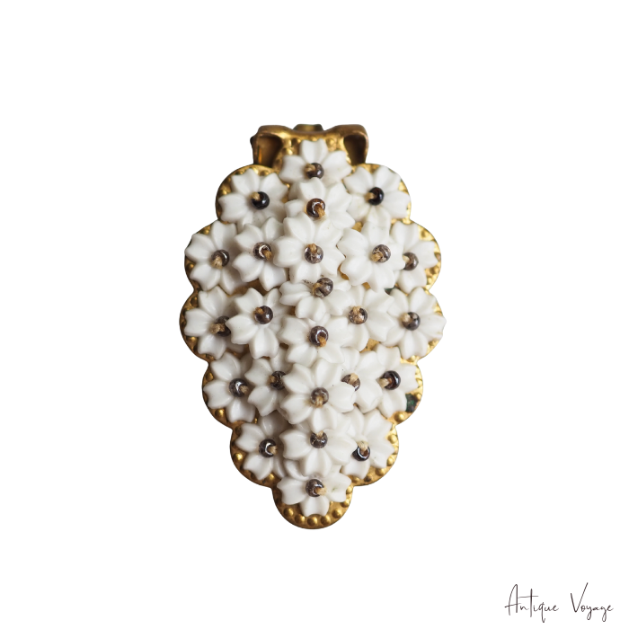 MIRIAM HASKELL(ミリアム ハスケル)初期☆ 1940年代 チェコガラスビーズ 白いお花のアンティーク・ドレスクリップ/ファークリップ