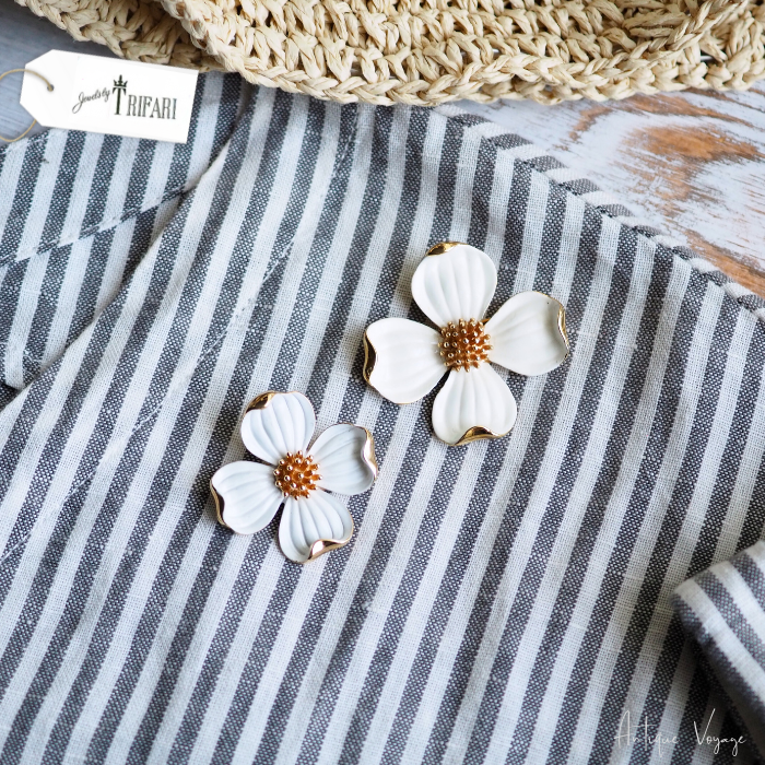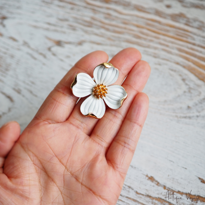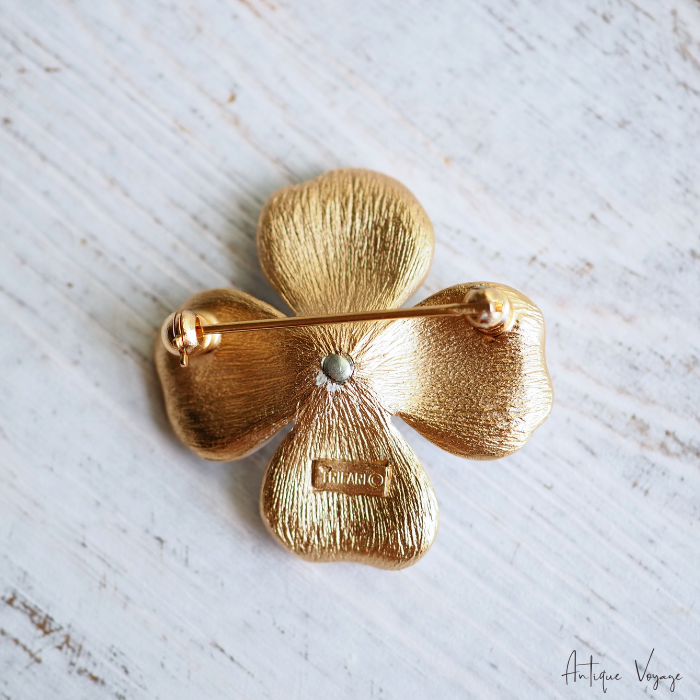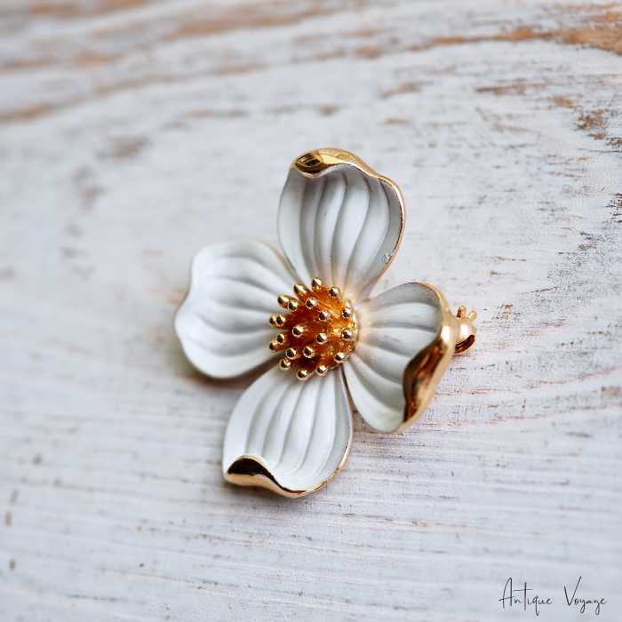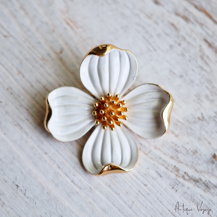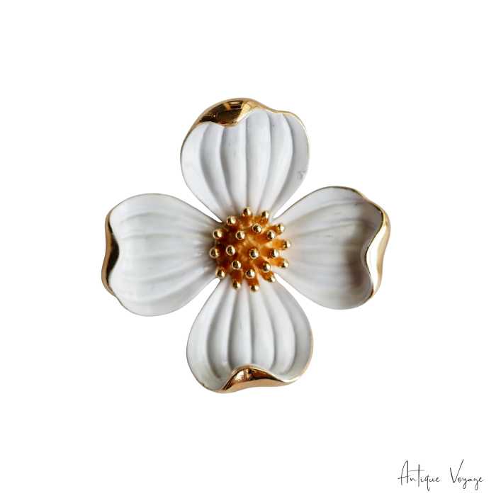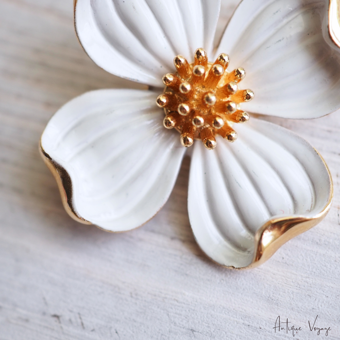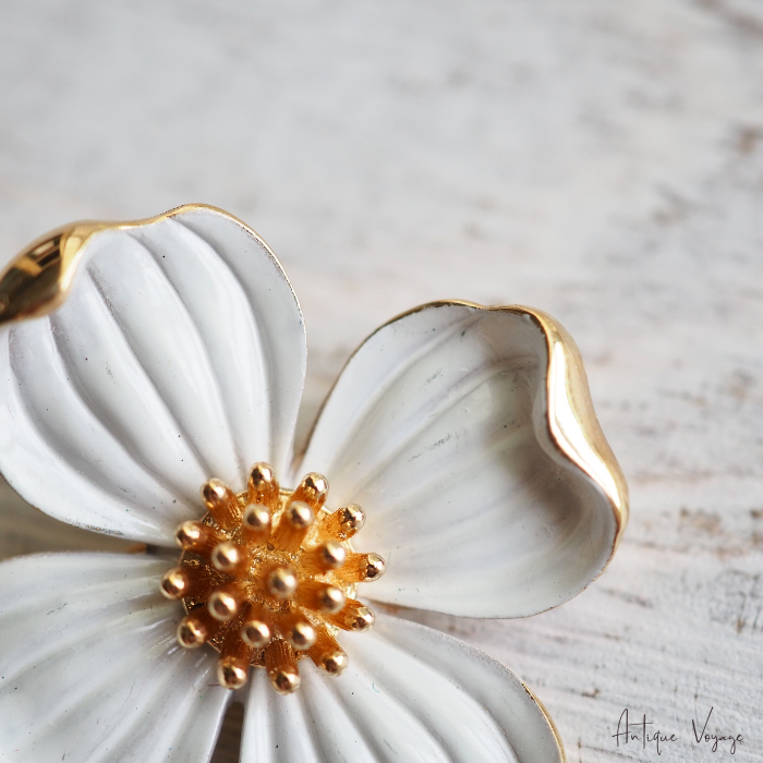 TRIFARI(トリファリ)の、ゴールドメタルとホワイトエナメルでデザインされた、白いハナミズキのヴィンテージ・ブローチです。