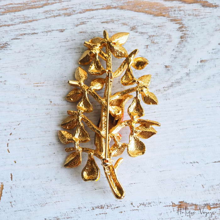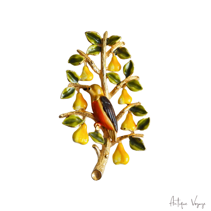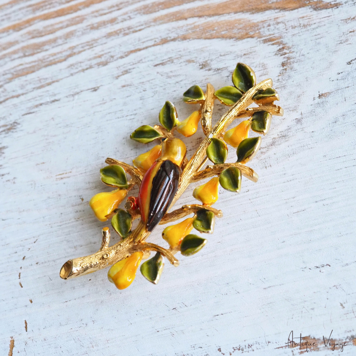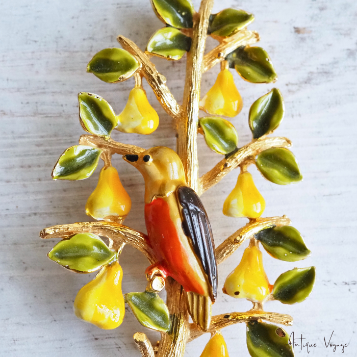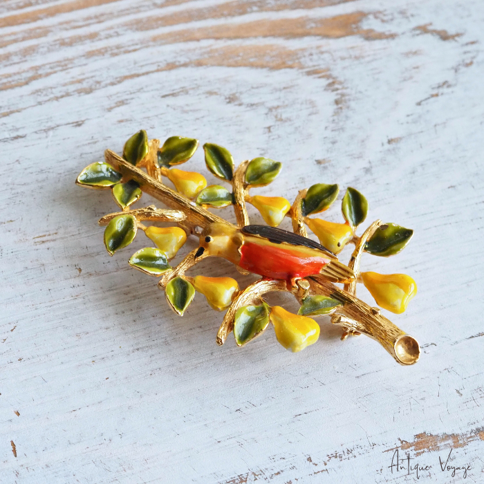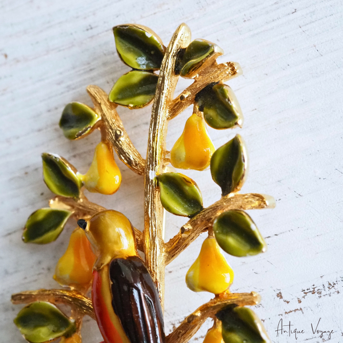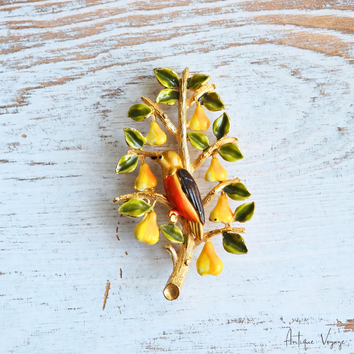 CADORO (カドロ)の、「梨の木のヤマウズラ」エナメル・ペアツリーのヴィンテージ・ブローチです。