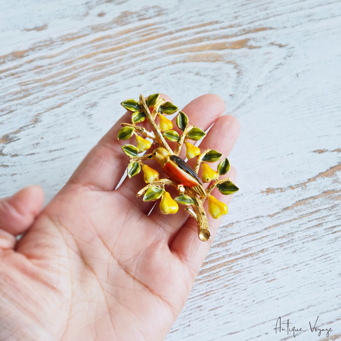 上質なゴールドトーンのメタル製で、小鳥がとまったペアツリーが立体的に細かく模られ、リーフ全体には濃薄グリーンティのエナメルペイント、梨にリッチな濃薄イエロー、小鳥はブラウン、オレンジ、イエローなどの秋カラーで描かれています。
