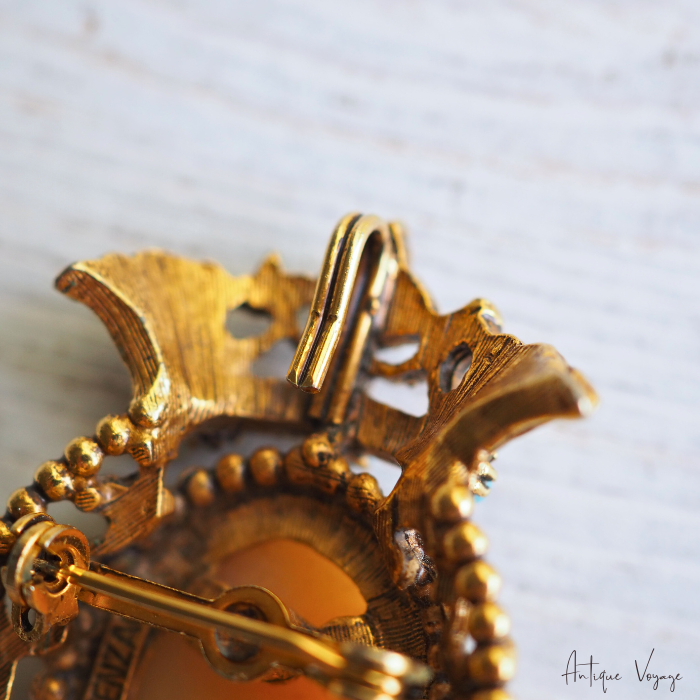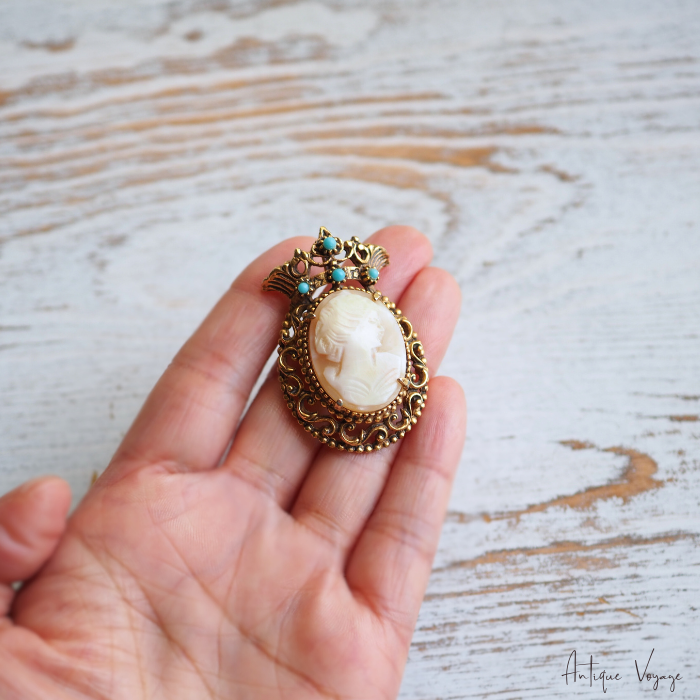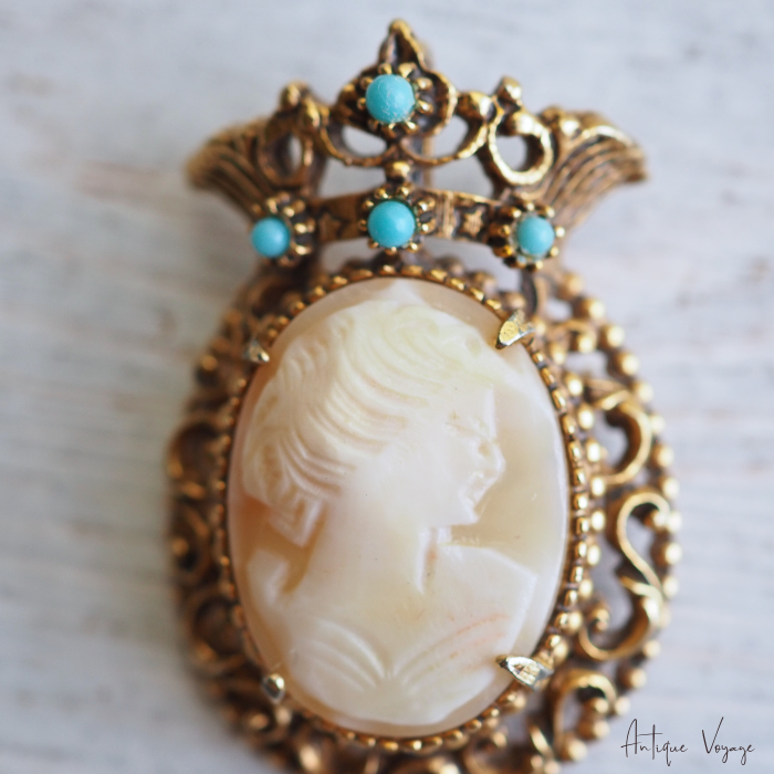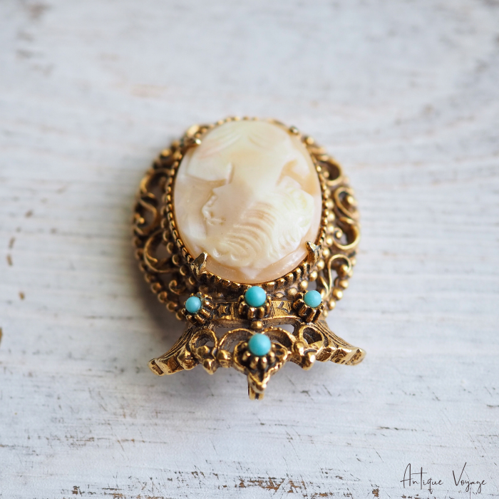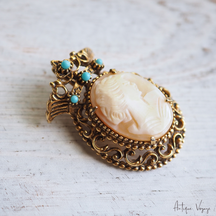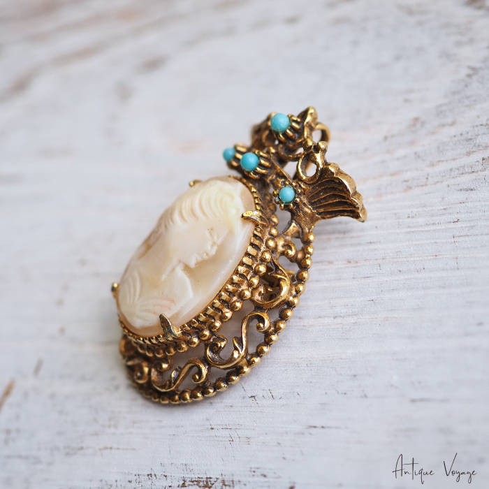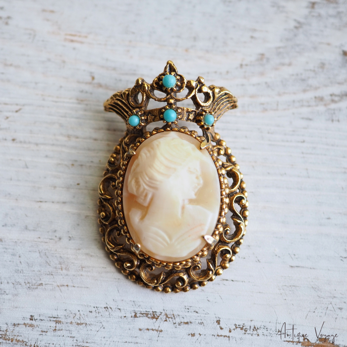 アンティーク・ブロンズゴールドトーンのメタル製で、ヴィクトリア朝クラウンデザインのフレーム枠が透かし細工で模られ、上部のクラウンに大きさ異なるフォックス・ターコイズビーズが4つ、中央には留め金で、手彫りのシェルカメオ(気品ある女性の姿)がはめ込まれています。