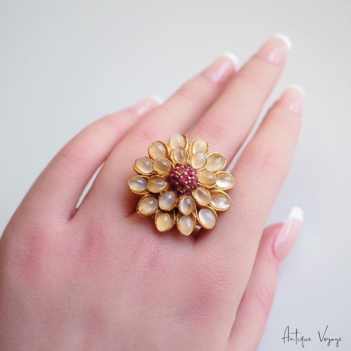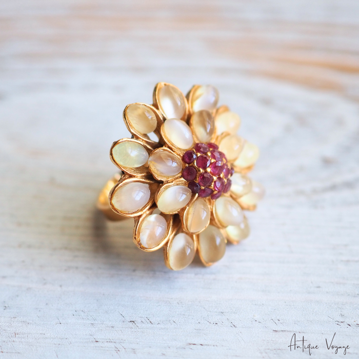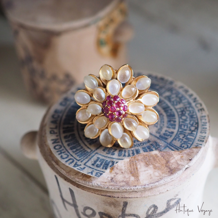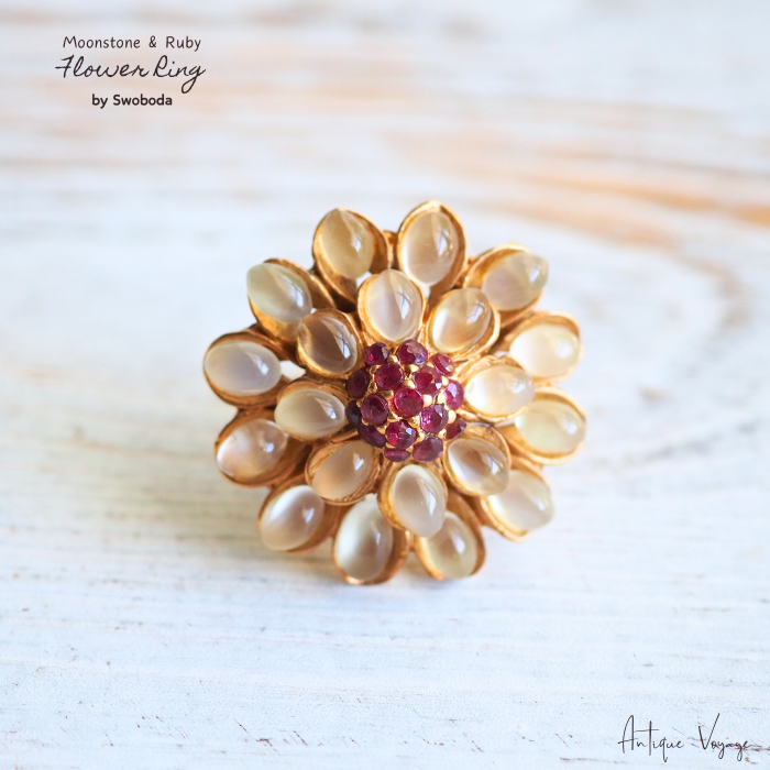 SWOBODA(スワボダ)による、天然石ムーンストーンとルビーを贅沢に使用したフラワーモチーフのヴィンテージリング【デッドストック】です。