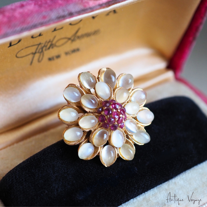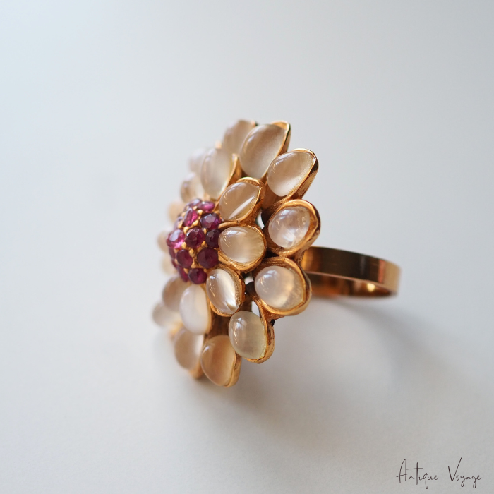 24金メッキが施されたメタル製で、立体的に模られた花びらの枠には、オーバルラウンドにカットされた艶やかなムーンストーンが2列で丁寧に配され、中央にはファセットカットで煌めくマゼンタカラーの小さなルビーが繊細にあしらわれています。