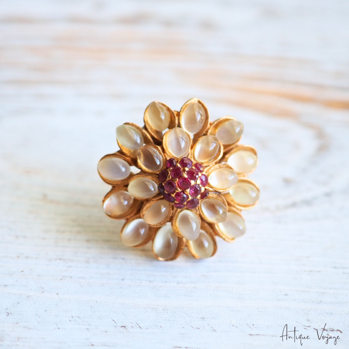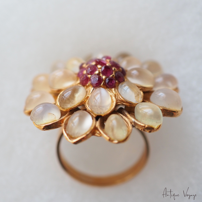 段々と重なり合う花びらのフォルムが印象的で、柔らかな光を放つムーンストーンと、中央のルビーとのコントラストが美しく調和しています。