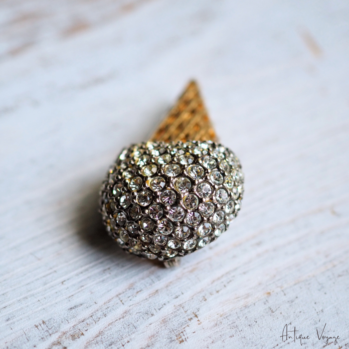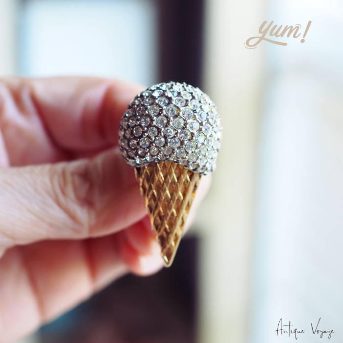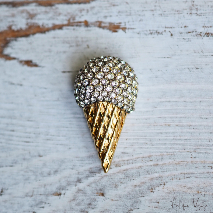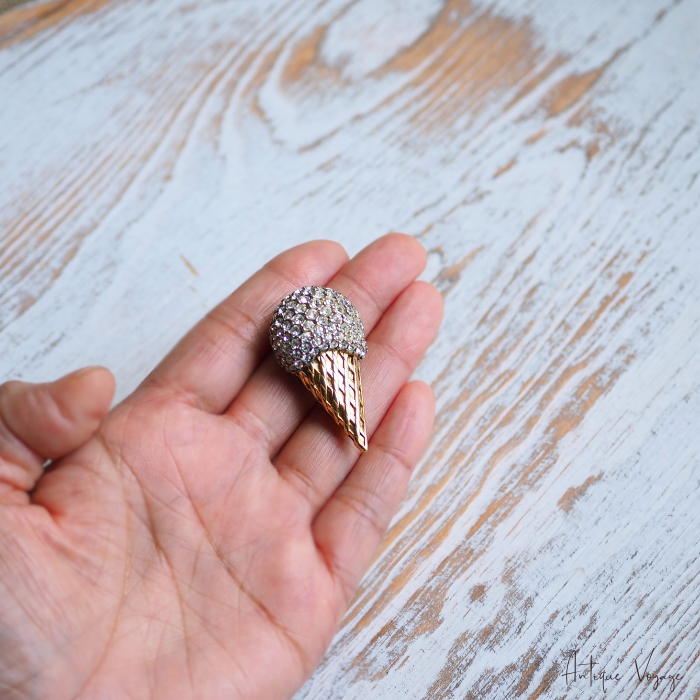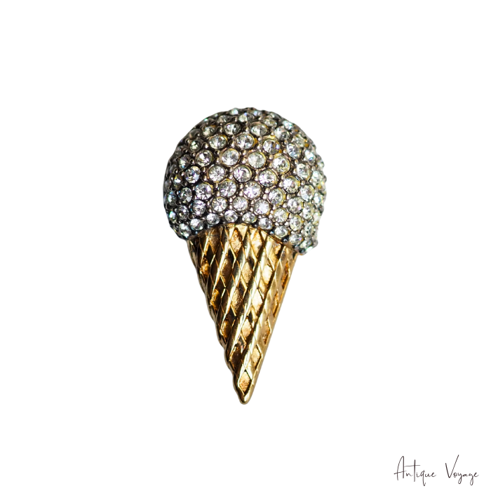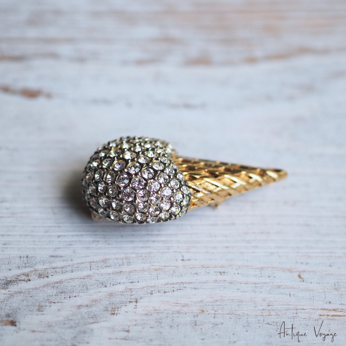 ゴールドトーンのメタル素材で、コーンのワッフルが格子でそれらしく模られ、トップのアイスクリームにはクリスタル・ラインストーンが端から端までぎっしりと、敷き詰められています。